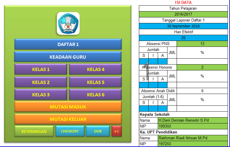 Aplikasi diatas berbentuk aplikasi Excel sederhana yang dapat Bapak/Ibu unduh secara gratis untuk menyimpan data keadaan Guru dan Siswa di Sekolah masing - masing. Aplikasi ini dapat digunakan untuk jenjang SD/MI, SMP/MTs, SMA/MA/SMK dan Sederajat. Demikianlah postingan kali ini, silahkan diunduh dan dibagikan. Salam Pendidikan.